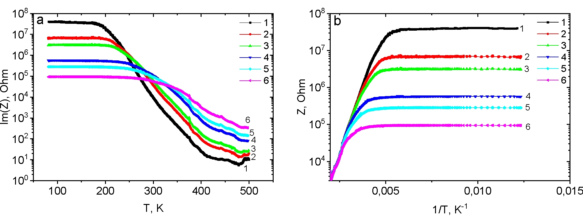 Рис. 3. Температурная зависимость мнимой части импеданса (a) и импеданса от обратной температуры (b) ω = 1 кГц (1), 5 кГц (2), 10 кГц (3), 50 кГц (4), 100 кГц (5), 1000 кГц (6) для образца Mn0,9S
