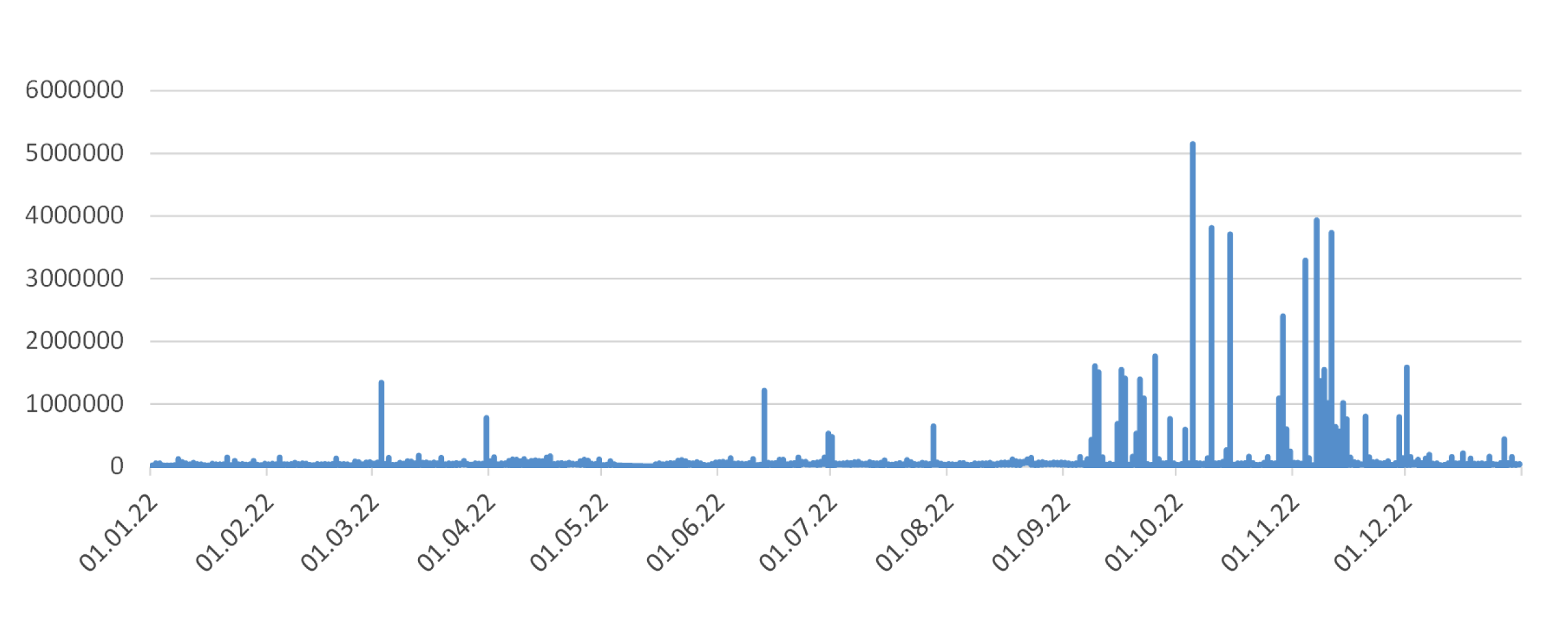 These criteria were formalized as rules for the primary traffic processing system according to a given syntax. Having processed the primary data using the created software, the aggregated data were obtained for further analysis. Each data set is a collection of pairs <time label, integral characteristic>. A typical yearly data set consists of 105 thousand records (the number of five-minute intervals in a year) and can be processed using desktop systems such as MS Excel. Figure 2 presents a diagram of the number of streams of zero duration for 2022. Anomalous values do not have a pronounced periodicity, they are several orders of magnitude higher than the average value (35256), due to which their identification can be automated.