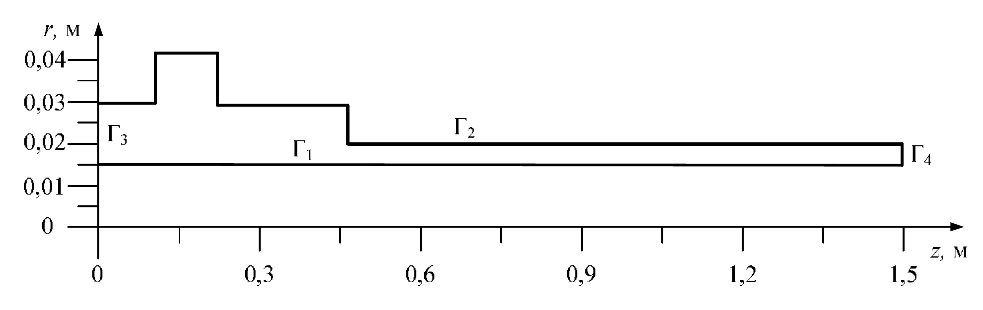When arguing the geometric conditions of unambiguity, the world's lightest 30-millimeter aircraft gun GSh-301 with a unique single-barrel automation circuit, which is in service with most modern aircraft and is planned to equip future aircraft weapons systems, was chosen. Since the barrel is a symmetrical body of rotation relative to the longitudinal axis, the introduction into consideration of a truncated region consisting of internal Γ1, external Γ2 and vertical boundaries Γ3, Γ4 located on one side of the longitudinal axis of the trunk is quite sufficient. Fig. 1 shows a diagram of the axial symmetry of the AAO type GSh-301 barrel in a cylindrical coordinate system (0, z, r,), specifying the diagram presented in article [17] by including the boundary designations Γ1 – Γ4, required for further clarifications. As before, the z axis coincides with the longitudinal axis of the barrel, and the temperature distribution in each calculated cross section of the barrel is symmetrical relative to the channel axis T = T(r).