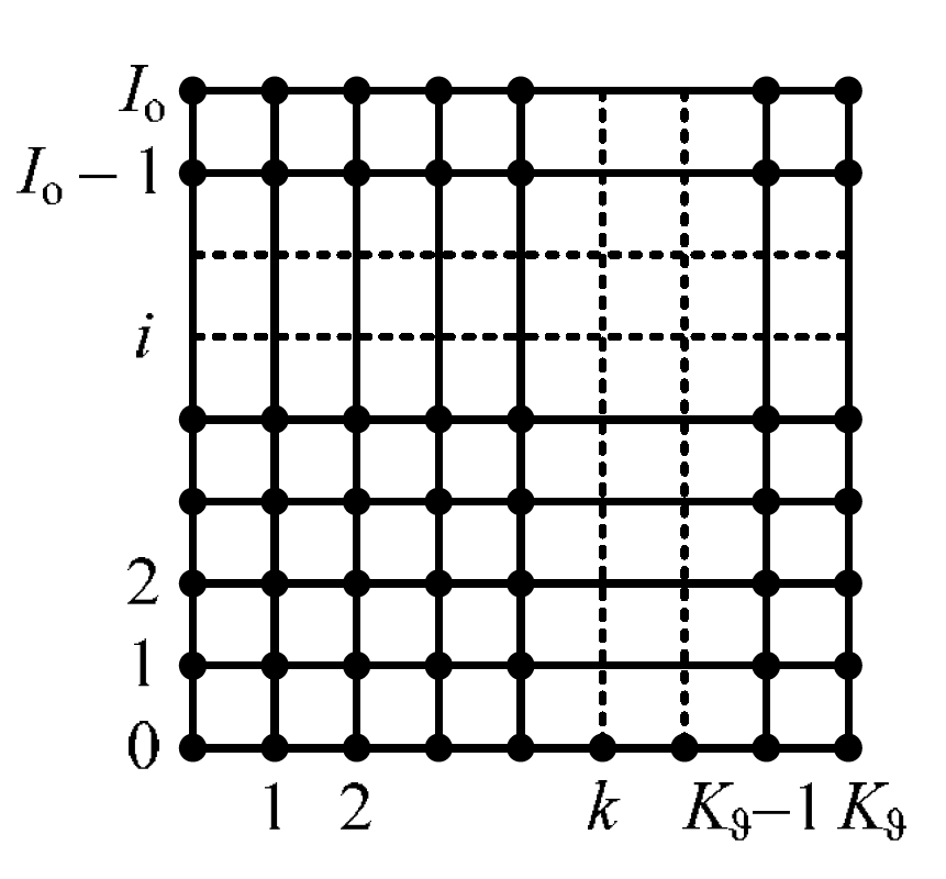 By analogy with the grid for the spatial domain , a temporary grid of the domain for calculating the value T i is introduced in the set of nodes τi,, defined by points i = 0, 1, 2, …, Iο, where i and Iο are the current and boundary, respectively, grid points for the formation of the finite difference barrel temperature T over time t. The time grid step t is designated Δτ.