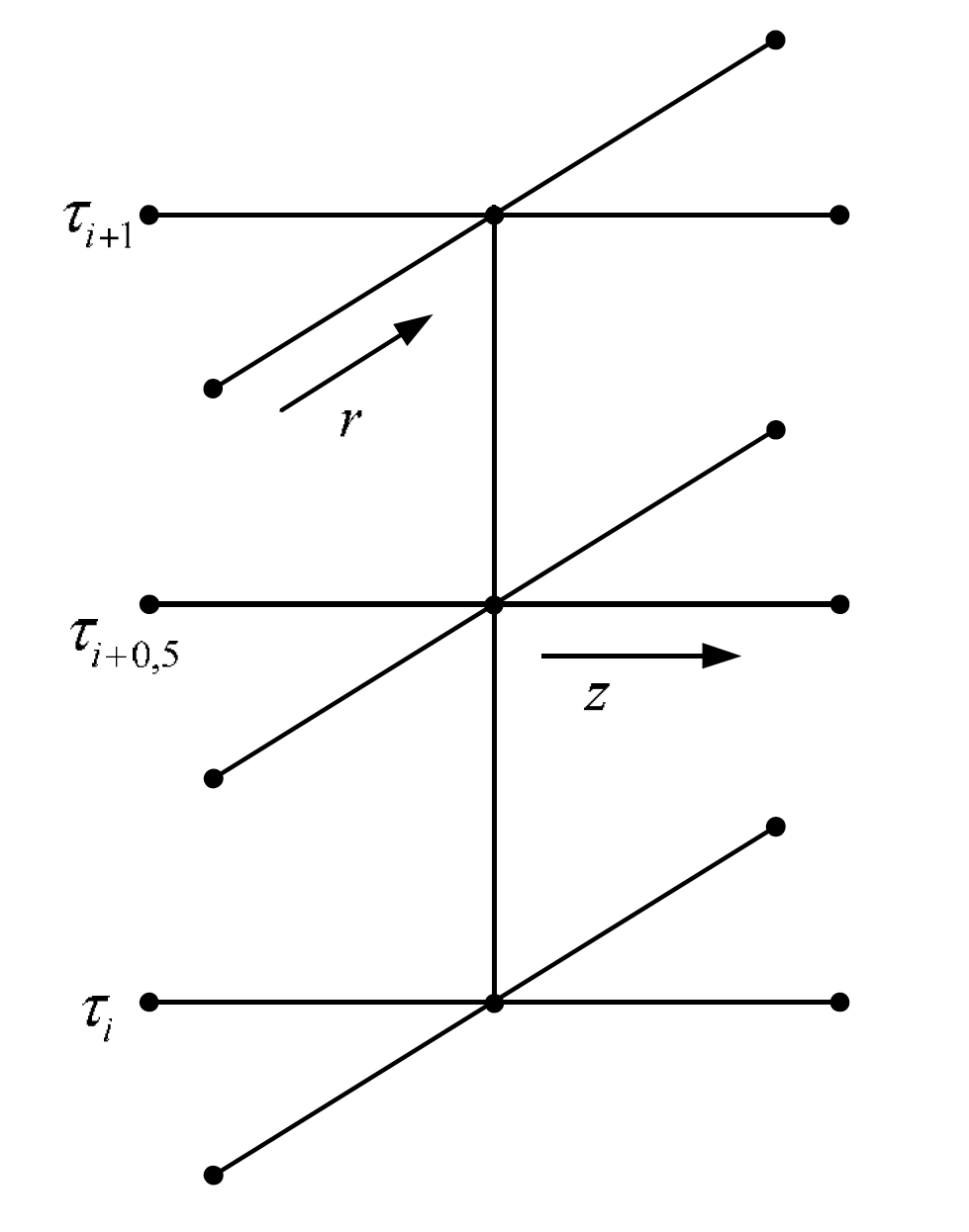 The difference scheme specified by a difference equation of the form (21) is more complicated, since each difference equation of the form (21), in addition to the unknown solution for the k-th spatial point, includes two more sought-after solutions for the neighboring (k – 1)-th and (k + 1)-th spatial points. All the sought solutions turn out to be “tied” with each other into a common non-degenerate system of difference equations. Thus, in this case, at each i-th time layer, the solutions are determined not by explicit formulas of the form (22), but from the solution of the system (Kϑ – 1) of difference equations, as a result of which the difference scheme specified by the difference equation of the form (21) is implicit. Effective algorithms for solving the system of equations (9) using an implicit difference scheme are much more complicated than numerical algorithms using an explicit difference scheme, but the time for solving the problem can be significantly reduced by a rational choice of steps Δz, Δr and Δτ.