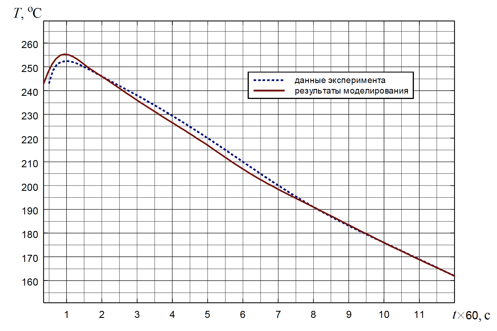 Analysis of the results obtained shows that there is a fairly good correlation between experiments and calculated data. Satisfactory agreement between the modeling results and the experimental data is confirmed by the fact that the averaged relative error in determining the barrel temperature T in the reference section does not exceed 0.6 %. In most works in the field of aviation artillery science, including the works of the co-author of the article, the discrepancy between this value in numerical and full-scale experiments is about 10 % [9; 11].