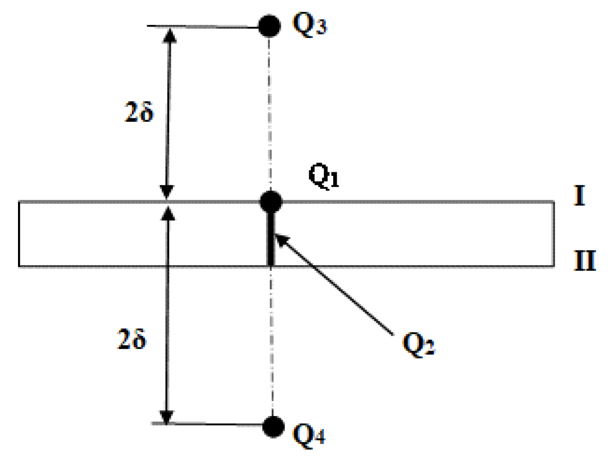 Рис. 2. Представление ЭЛС в графическом виде: δ – толщина детали; Q1 – мгновенный точечный источник; Q2 – мгновенный линейный источник; Q3 и Q4 – фиктивные точечные источники