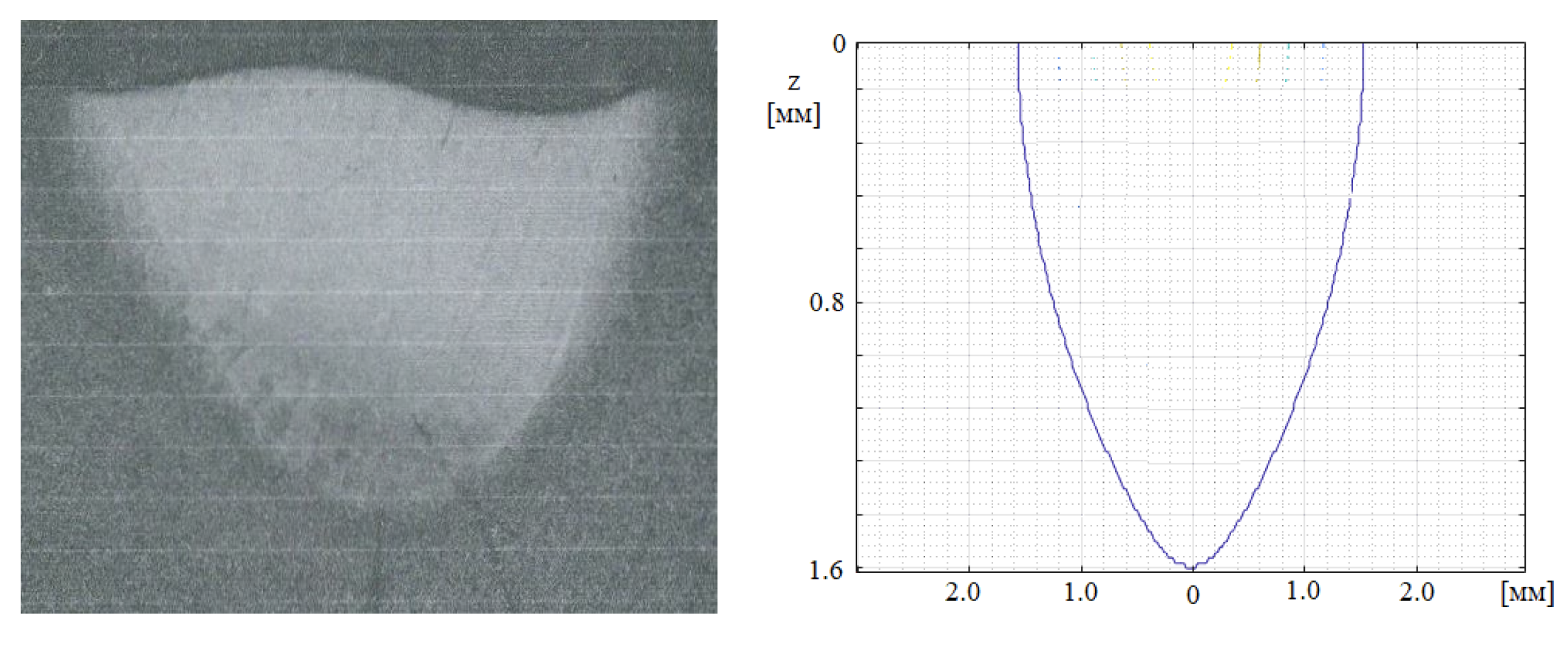 The used heat process model (1) was investigated and tuned for the VT-14 material with a melting thickness of 1.5 ± 0.5 mm. To compare the shape of the cross -section of the seam and the modeled zone of thermal influence, the correspondence of the ratio of the size of the width to the depth of the seam was made. In Fig. 3 shows the results of the modeling and the form of the grinding of the corresponding welding mode. The schedule of the zone of thermal influence was obtained by the number (1) and the selection of the section of the heating zone according to the coordinates corresponding to the greatest deviation of the temperature of the thermal influence (for VT-14-600 ºС) from the heating exhaust position.