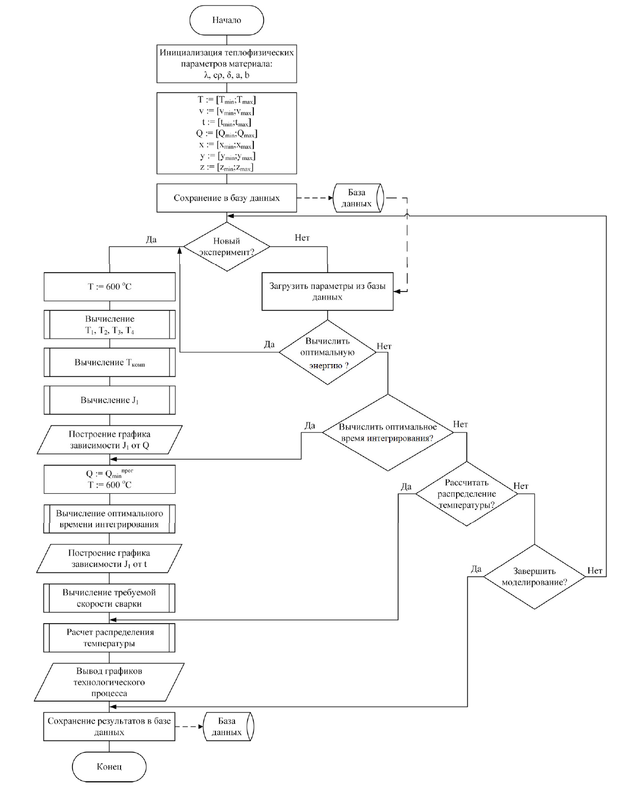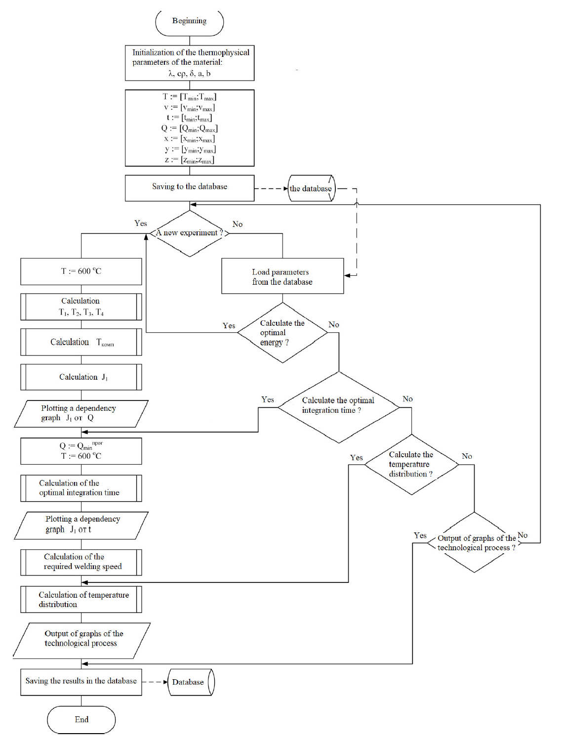 The algorithm is based on the models proposed in this study (1) - (4). After the initialization of the technological parameters, the following parameters are set: T-the temperature of the granular zone of thermal influence (from minimum to maximum), t is the time of integration, V is the speed of welding, Q is the energy of the heating sources, x-coordinates in length of the product, y - coordinates in width of the product, z - coordinates in height of the product. Further, values are co-preserved in the database for further use in future calculations. If the experiment is new, then to calculate the energy of the heating source, the values of the temperature, integration time and welding rate are set, after the heating temperature (1) with the current fictitious and real sources is calculated. Next, using Crichera optimality (2), the required energy is calculated, providing a uniform zone heating the weld. To find the integration time, the resulting energy is set and the temperature of the boundary zone of thermal influence, then the temperature of the het is calculated by variating the rest of the parameters in a certain range. Knowing the optimal values of the energy, integration time, the welding speeds are calculated, similarly to the previous stages.