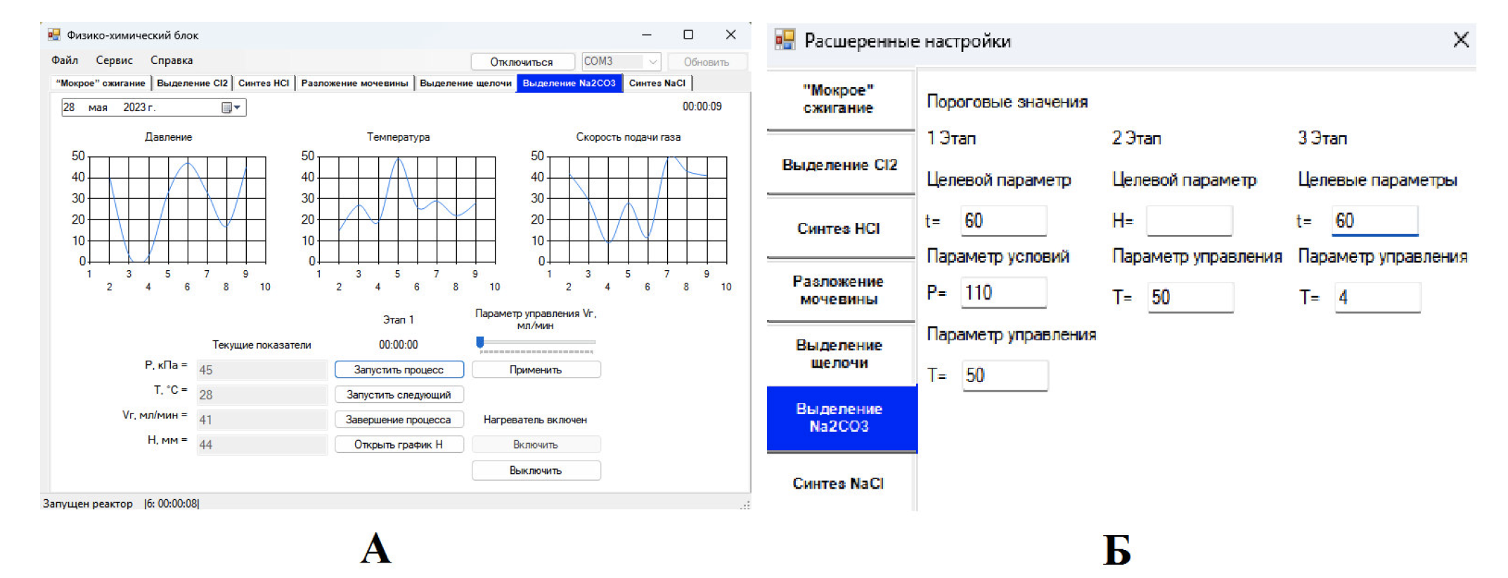 Рис. 3. Окно ПО во время работы: А – отображение параметров текущего процесса (выделение Na2CO3); Б – отображение настроек реактора выделения Na2CO3