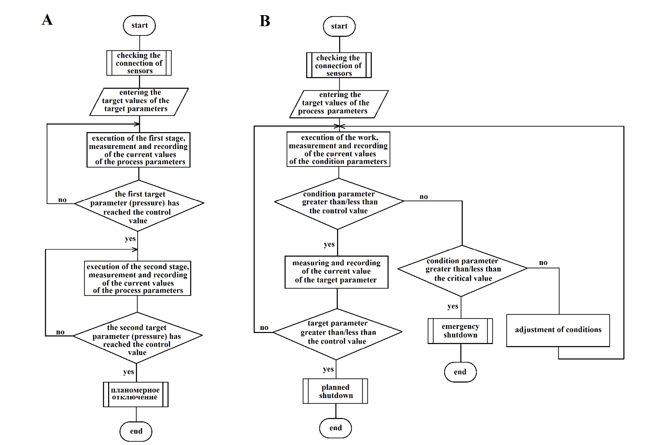 Fig. 2. Reactor operation algorithms: A – without control of the parameters of the process conditions; Б – with control of the parameters of the process conditions