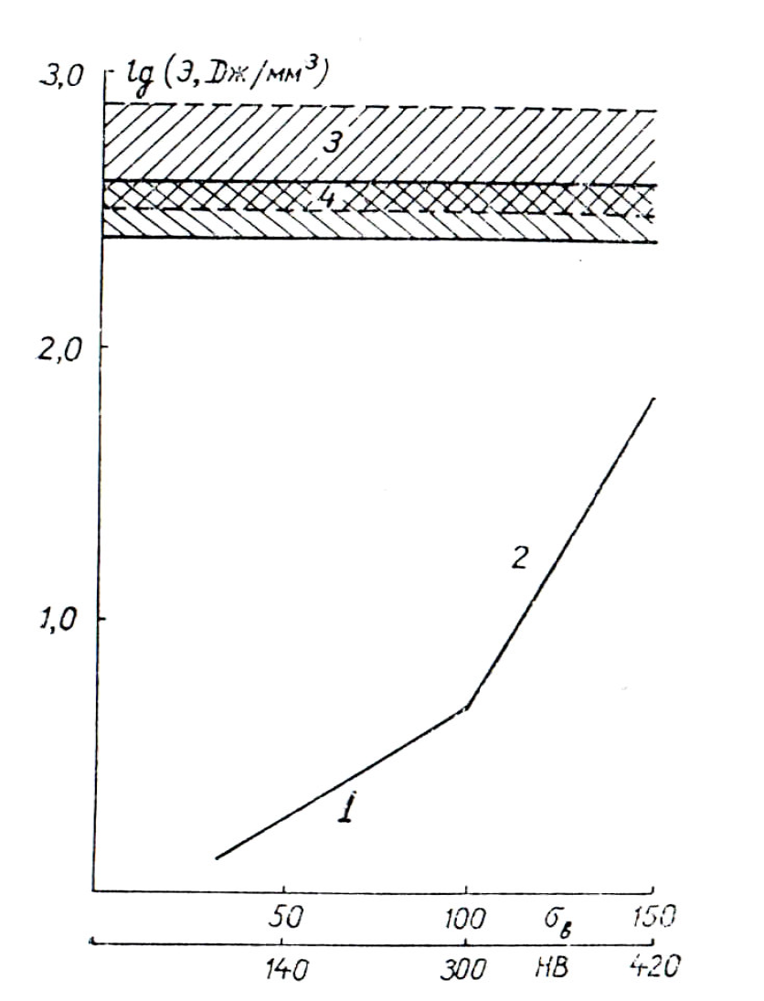 Рис. 1. Энергоёмкость некоторых видов обработки: 1 - обработка лезвийным инструментом; 2 - шлифование; 3 - электроимпульсная; 4 – ЭХО