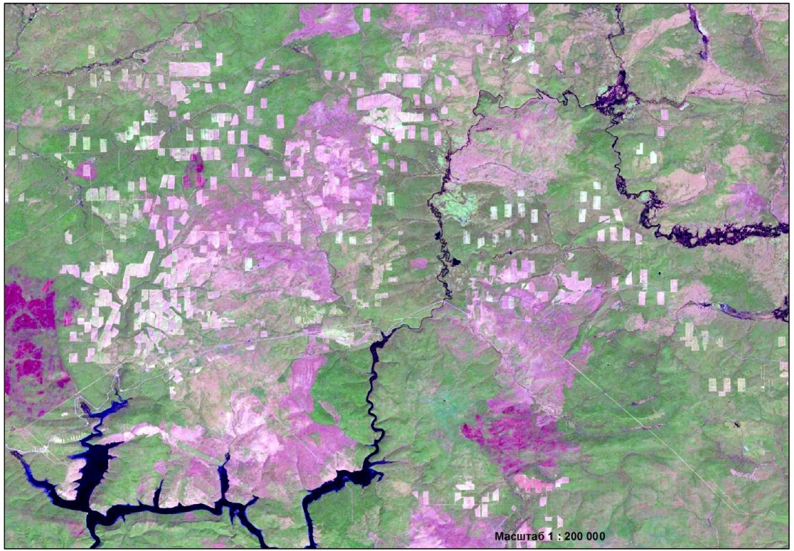 Fig. 1. Deforestation of the leased territory of Lesosibirsk LDK No. 1 (Boguchansky and Kezhemsky districts of Krasnoyarsk Krai). Landsat-8TM satellite image, 2022