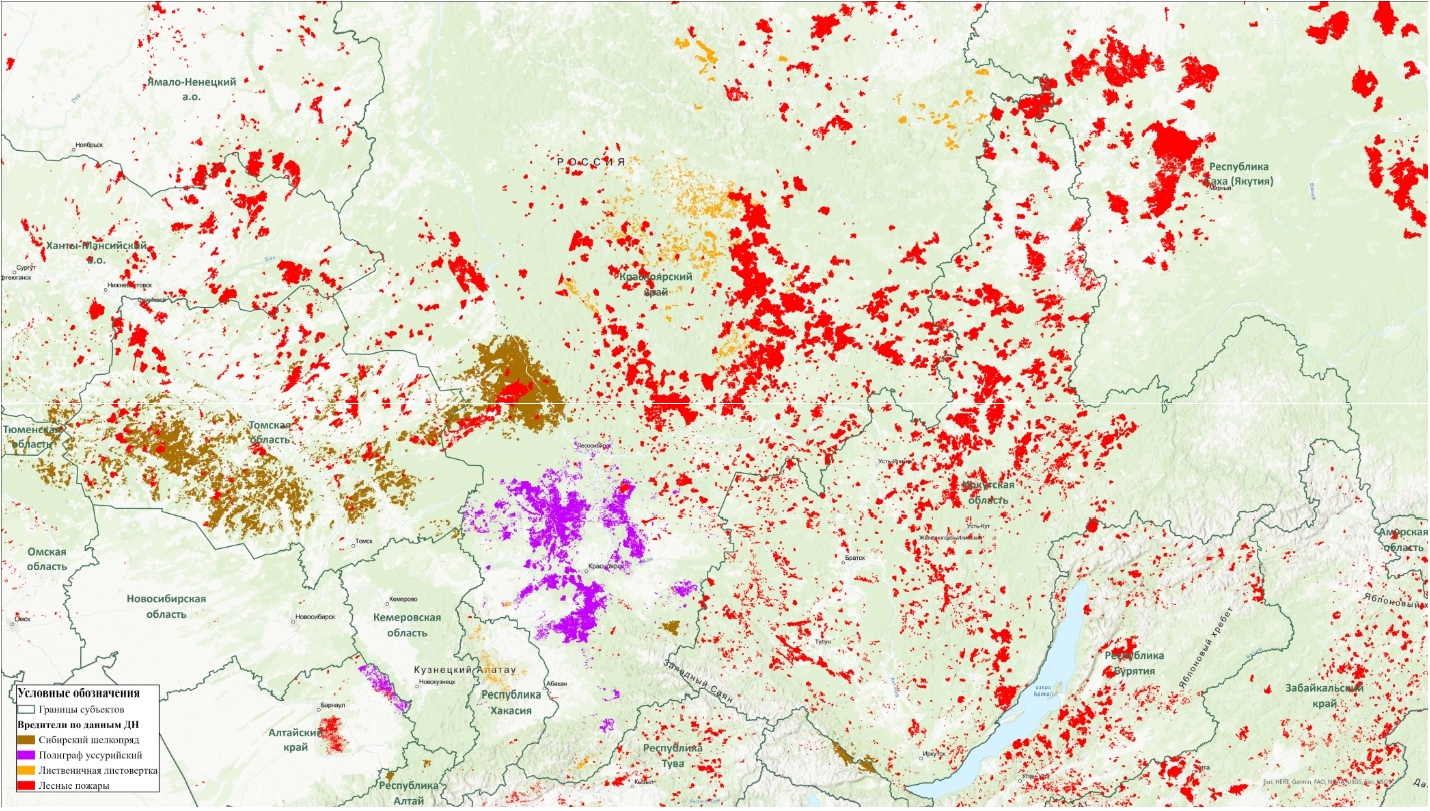 Рис. 2. Нарушенность лесов Сибири лесными пожарами и вспышками массового размножения насекомых-вредителей