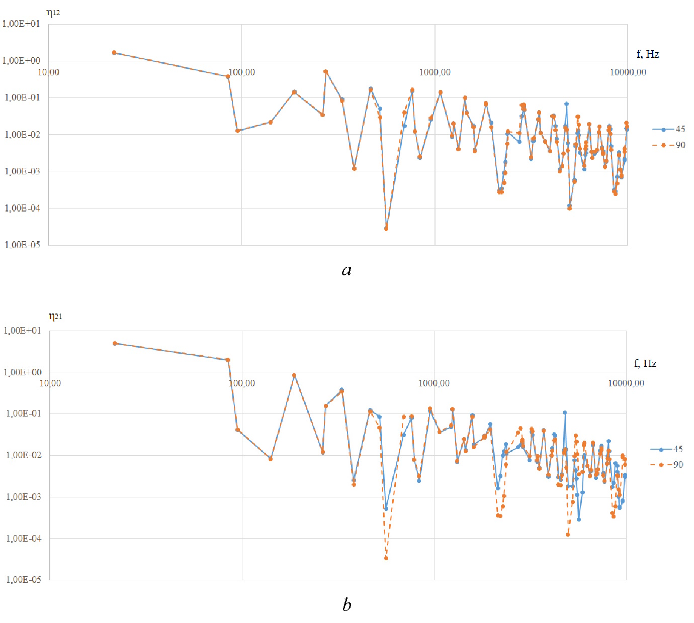 From the graphs shown in Fig. 2 it can be seen that the values of the coupling loss factors of two beams during the energy transition from the first to the second η12 and, conversely, from the second to the first η21, increase slightly as the angle between the beams decreases. At the same time, the difference in the values of η21 for the cases of connecting beams at angles of 90° and 45° is more noticeable at certain natural frequencies.