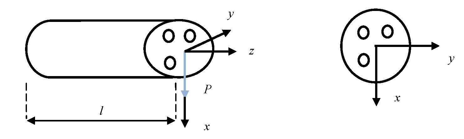 Рассмотрим брус, изготовленный из упруго-пластического материала, армированный n упругими волокнами. Один конец бруса закреплен в точке z=0, на втором конце бруса при z=1 подвешен груз весом Р в начале координат, который совпадает с центром тяжести сечения (рис. 1).