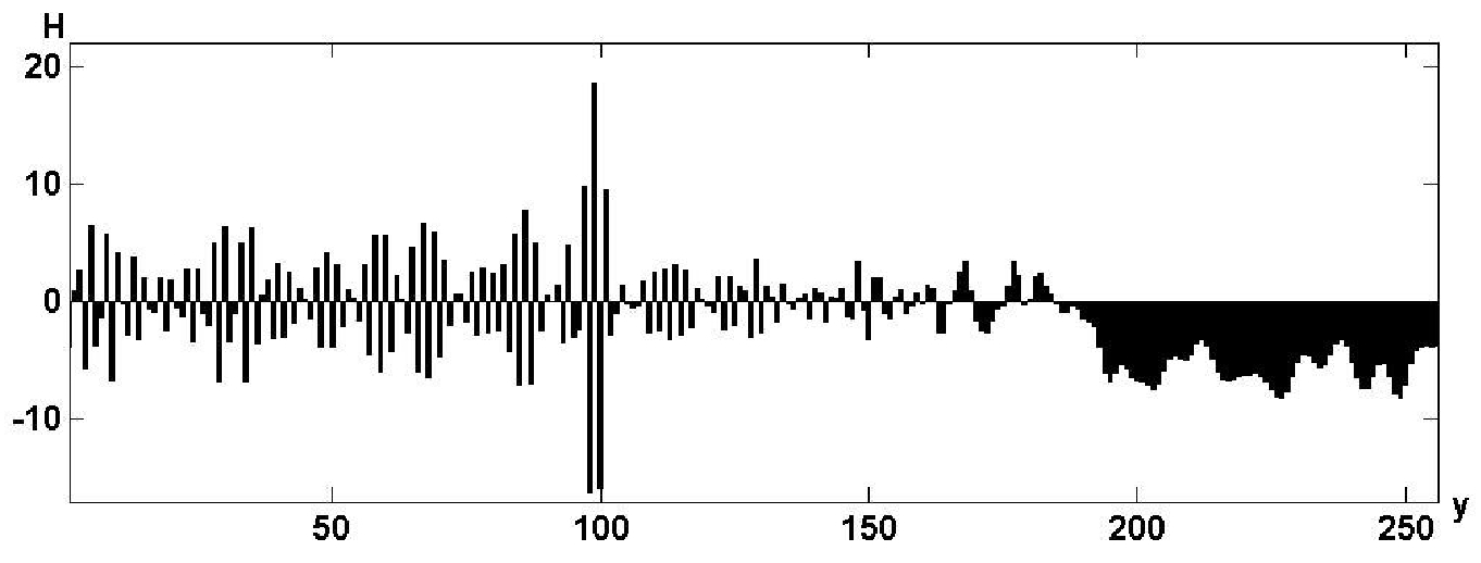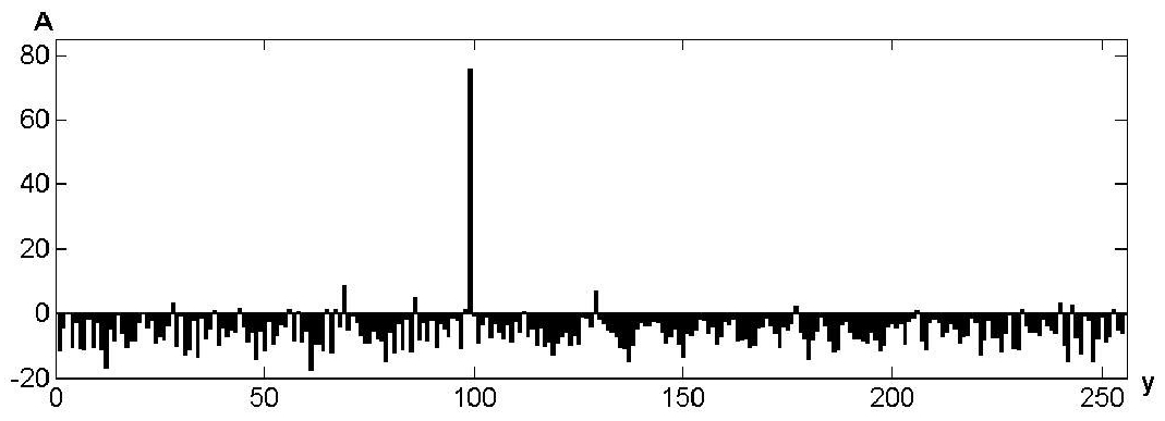 Fig. 8 presents a fragment of one of four arrays when decoding a hologram containing 128 errors with n = 256 (50 % errors), coded value Y = 100. It shows that, despite the absence of an extremum at point Y = 100, the value of the input block can be recovered from a characteristic combination of symmetrically located four side maxima.