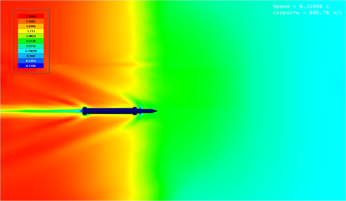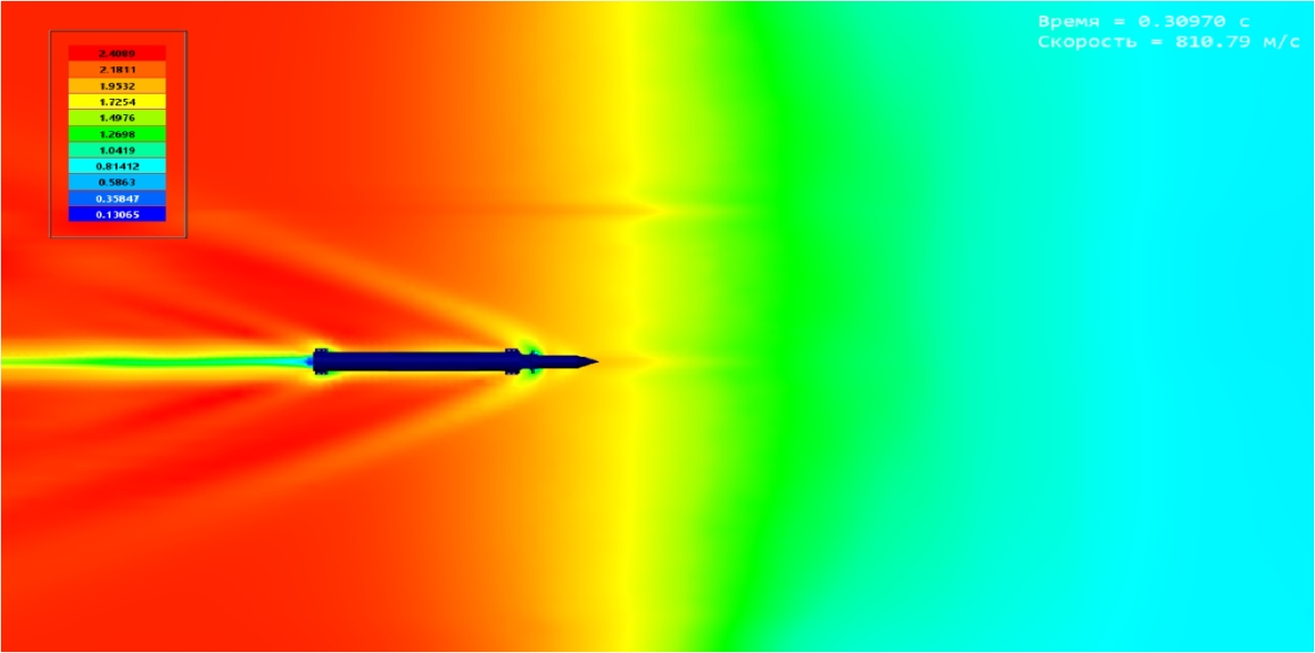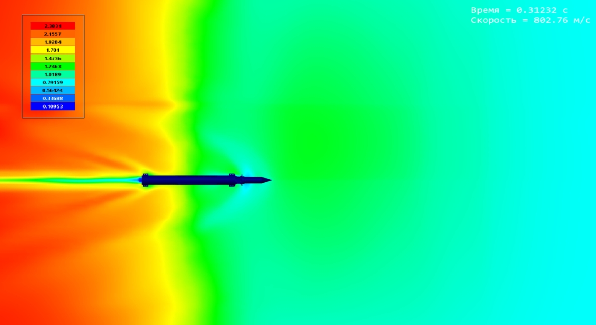 The movement of the TS-TO system is considered at a supersonic speed of 846.8 m/s, approximately 2.5 M at 0.31 s, the carriage enters a tunnel filled with helium. The design thrust of the solid propellant rocket engine is assumed to be 4.3 t.s.