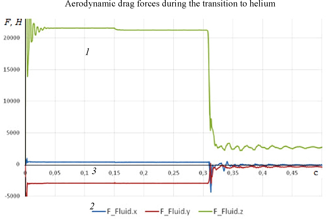 Рис. 5. Графики, иллюстрирующие изменение действующих сил по осям X, Y, Z на поверхность 3D-модели трековой каретки с объектом испытания при вхождении в гелиевый участок трека при скорости 830 м/с: 1 – сила аэродинамического сопротивления по оси X (зеленый цвет); 2 – вертикальная ось Y (красный цвет); 3 – Z на графике отражает поперечную боковую нагрузку (синий цвет). По оси абсцисс время в с