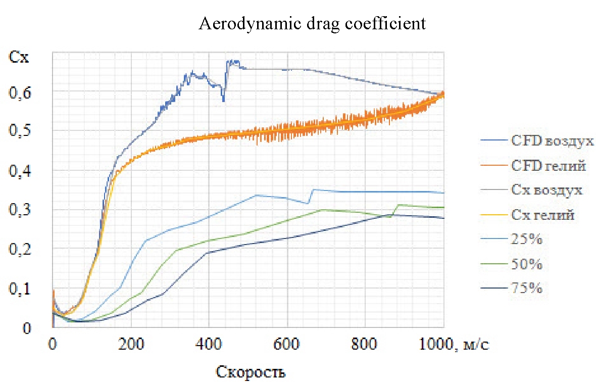 The results of modeling the entry of a monorail track sled into the helium section of the track show the significant impact of reducing aerodynamic drag. The wave pattern of interaction between the surface of the TS-TO track moving equipment changes, namely, a series of shock waves changes its configuration. The Mach cone angle increases, the configuration of the bow shock takes on the form of a direct shock wave, characteristic of a lower speed of flow around structural elements. The wave resistance changes proportional to the product of the density of the medium and the speed of sound in a given medium. The structure of the boundary layer changes when the flow moves around the cone of the head part and especially the interface between the cone and the cylinder of the head fairing of the test object. Fig. 6 exhibits the influence of the density of the medium in a gallery containing different percentages of the air-helium mixture on the aerodynamic drag coefficient of the TS-TO dynamic system.