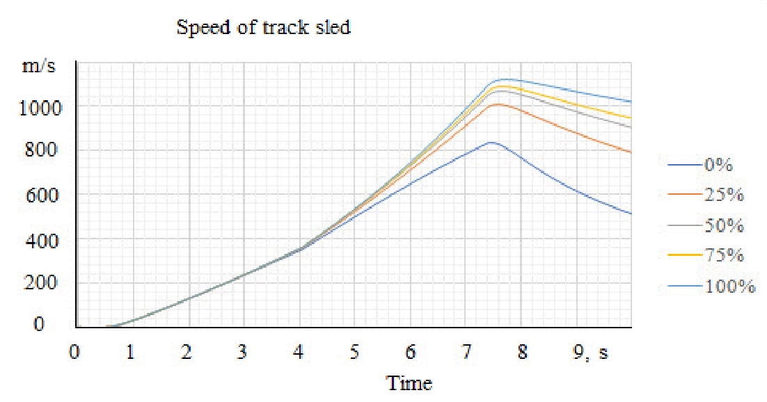 Fig. 7 demonstrates when accelerating a track sled with a test object at the considered total mass of equipment and solid propellant thrust is equal to 43 kN, a speed of 830 m/s is achieved, and with a mixture of air and helium in an equal proportion of 50 % by volume, the speed is achieved 1000 m/s. In a helium environment, the speed will be already 1120 m/s.