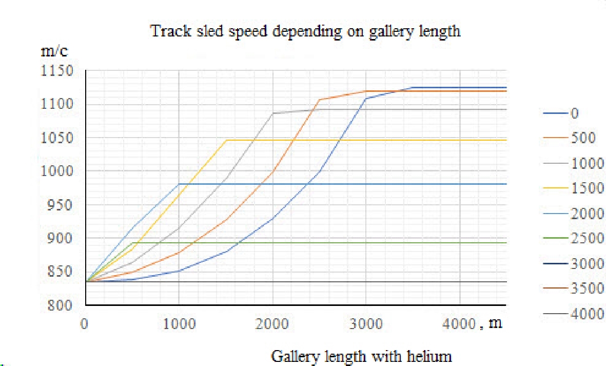 The maximum effect of increasing the acceleration speed of the track sled is expected in a helium environment. The costs of arranging a track gallery and acquiring the required mass of helium can be reduced by choosing a rational length of the gallery according to the calculated graphs from Fig. 10, while achieving the planned effect of increasing the maximum acceleration speed of the dynamic TS-TO system.