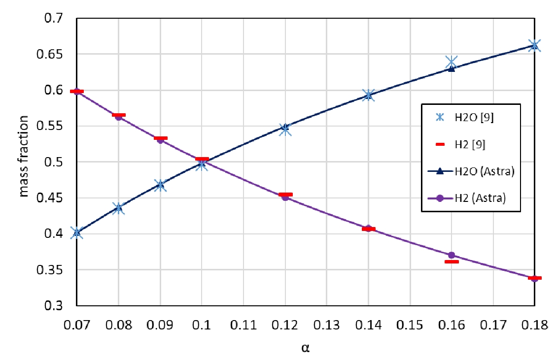 The thermodynamic parameters of the generator gas were calculated using the Rocket Propulsion Analysis (RPA) and Astra programs. These programs allow you to obtain the properties of combustion products at equilibrium gas composition. The Astra program was created at the Moscow State Technical University named after N. E. Bauman and is intended to determine the characteristics of equilibrium, phase and chemical composition of arbitrary systems, including for the thermodynamic calculation of liquid propellant engines [19].