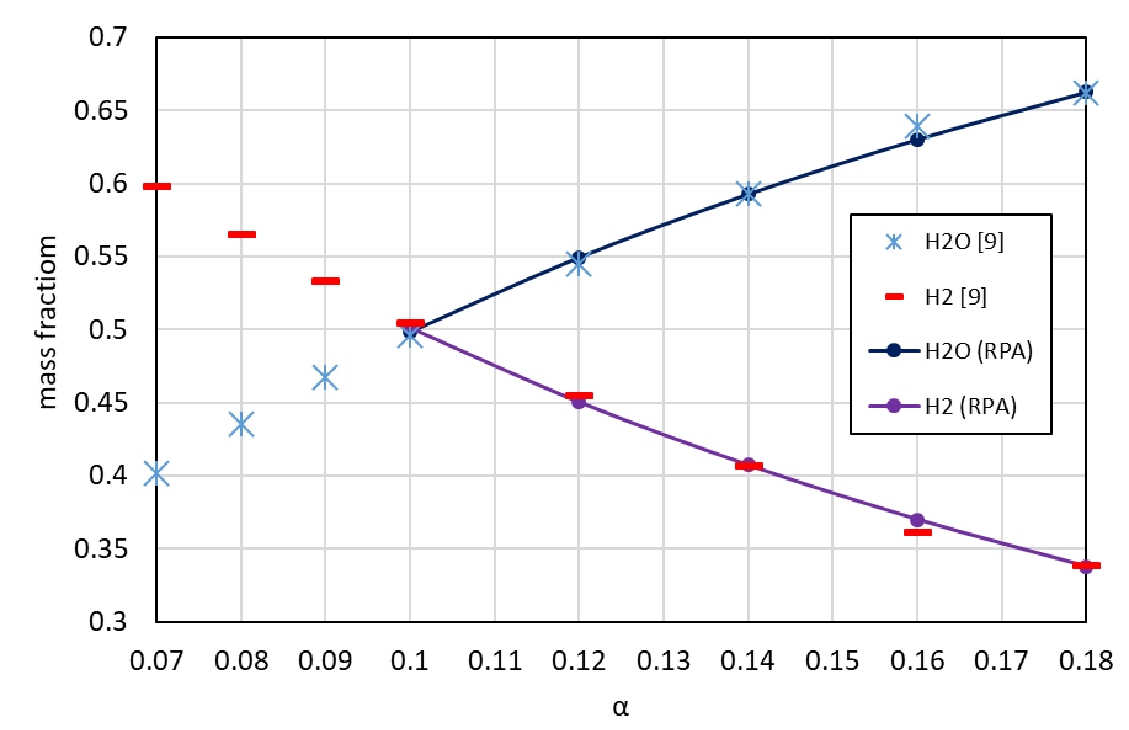 When analyzing the results of calculating mass fractions obtained in the Astra program, the convergence of the data was confirmed with an average error of no more than 0.54 % (Fig. 1). While the values obtained in RPA (Fig. 2) have an average error of no more than 0.69 %.