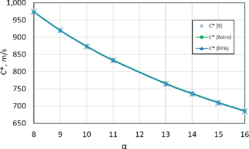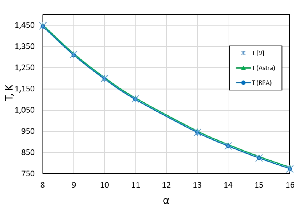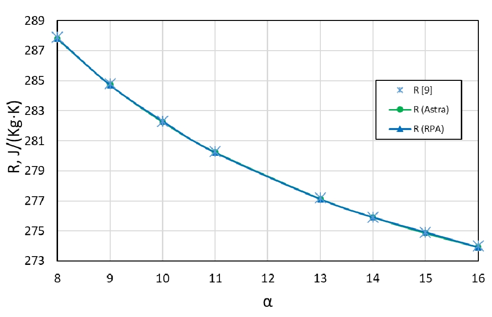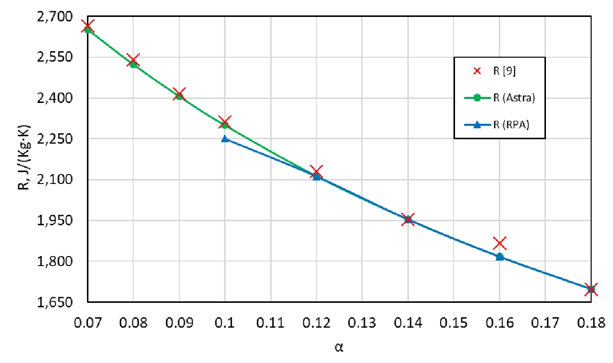 Figure 3 shows the dependence of the gas constant R on the oxidizer excess coefficient, which does not correspond to the calculated values by 0.7 and 1.3 % in the Astra and RPA programs, respectively.