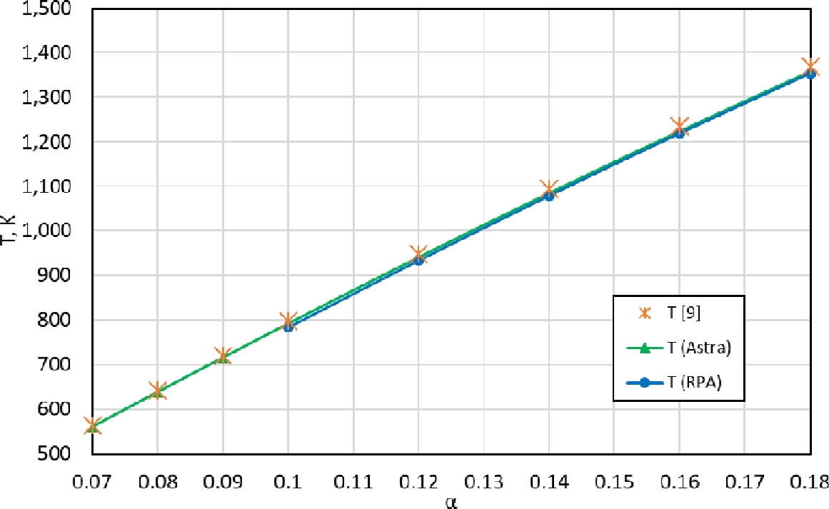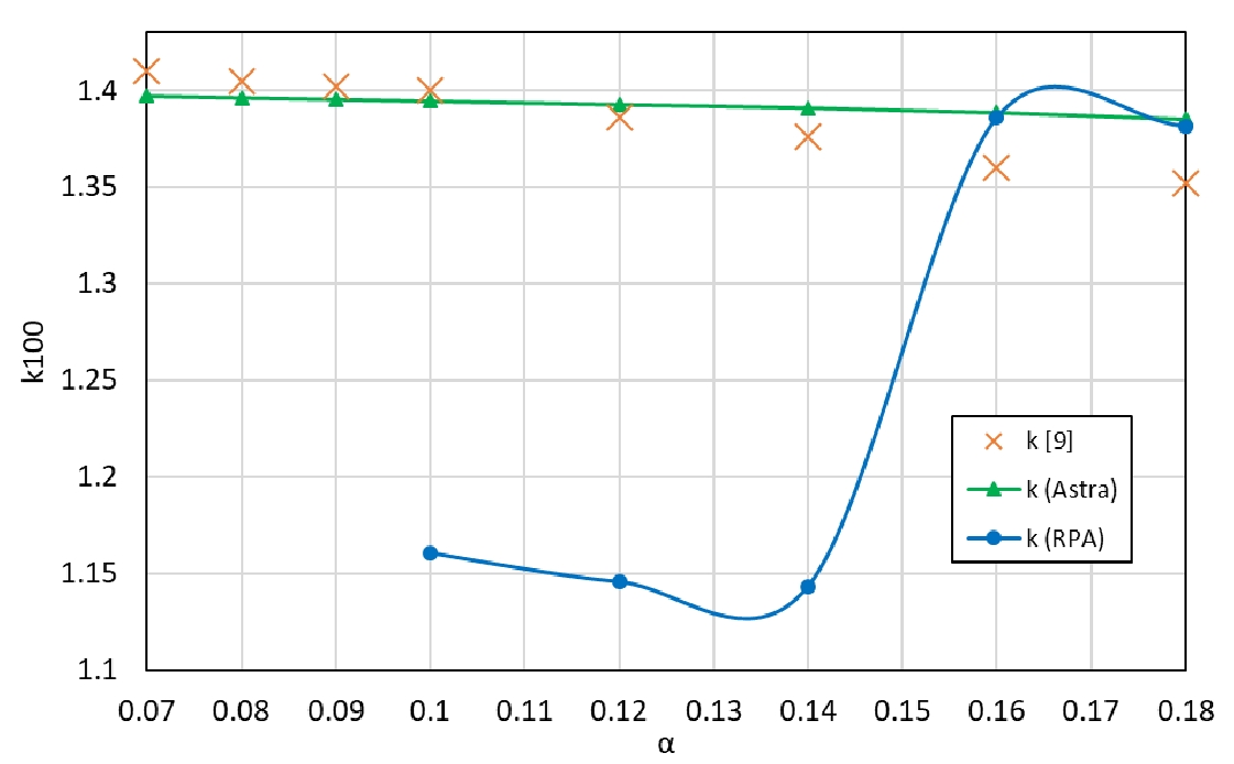 The values of the expansion isentropic index k100 obtained in RPA have a discrepancy of 10 % with the calculated data, and the results obtained using the ASTRA-M program show qualitative convergence (Fig. 6). The average error of thermodynamic calculations is given in table 3.