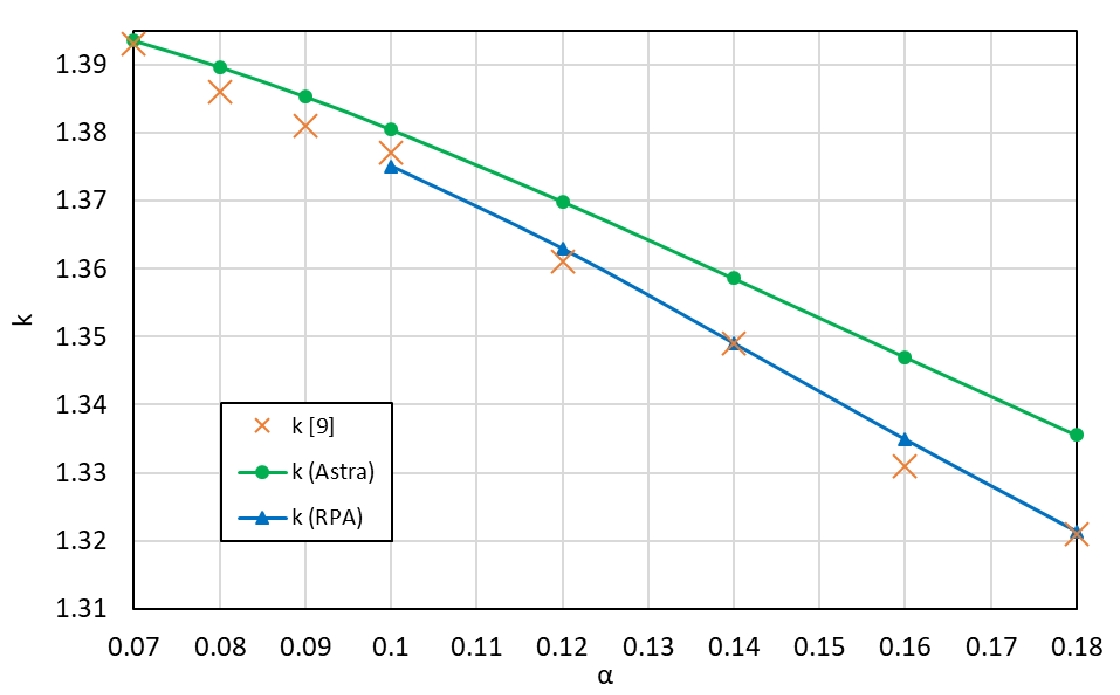 Figure 5 shows the values of the expansion isentropic index corresponding to the critical pressure difference (pgg/pa = 2) obtained in the RPA and Astra programs. When analyzing the values, it was revealed that they have close convergence (no more than 0.57 %) with the calculated data.