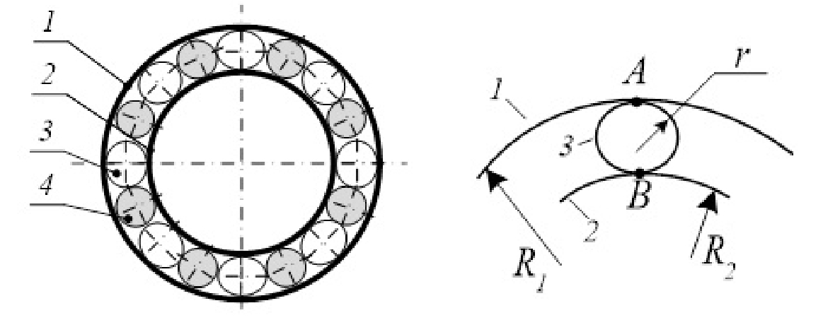 Рис. 1. Конструкция кольцевого токосъемного устройства: 1 – наружное токосъемное кольцо; 2 – внутреннее токосъемное кольцо; 3 – ролик-изолятор; 4 – контактное кольцо