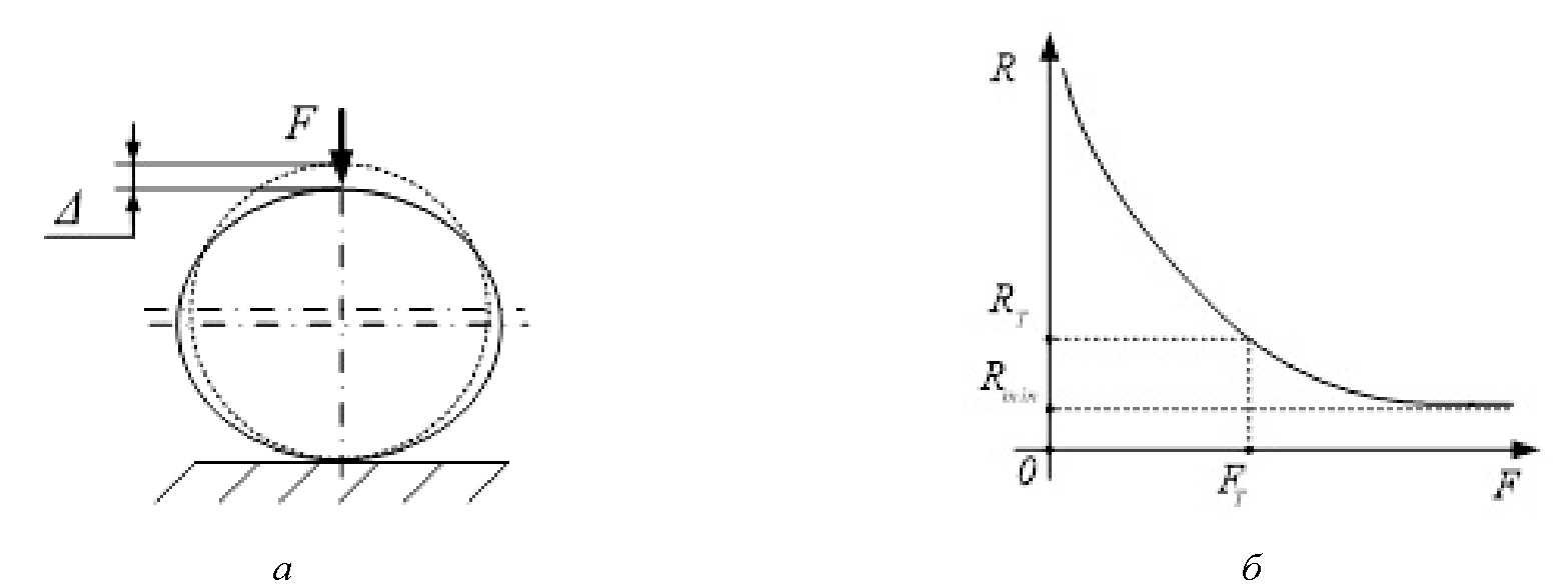 Рис. 2. Нагружение контактного кольца: а – деформационное и эквивалентное силовое нагружение (сжатие силой F); б – зависимость сопротивления контактов R от силы сжатия F