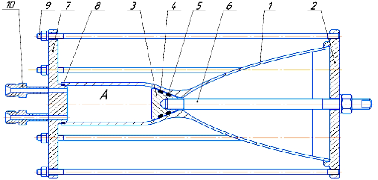 The working body for testing is fed into the cavity «A» through the inlet fitting 10 and removed through the outlet fitting. The tightness of the cavity is ensured by sealing rings 4, 5, 8. Therefore, special requirements on roughness and dimensional accuracy are imposed on the mating surfaces of the chamber-demonstrator 1, as well as flange 7 and clamp 3 with rings. For uniform pressing of the sealing ring 8 to the surfaces of the flange 7 and the demonstrator chamber 1, six studs 9 arranged evenly around the circumference are used. Pressing of sealing rings 4 and 5 from the side of critical section is provided by means of rod 6. The strength calculation of the loaded elements of the device showed the necessary safety margin for the test.