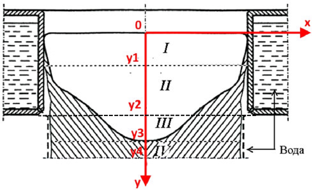 Рис. 1. Разделение слитка на области в процессе литья. Введение системы координат