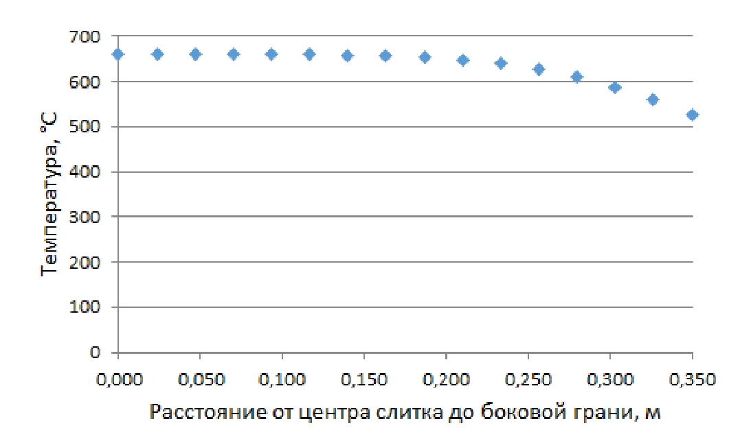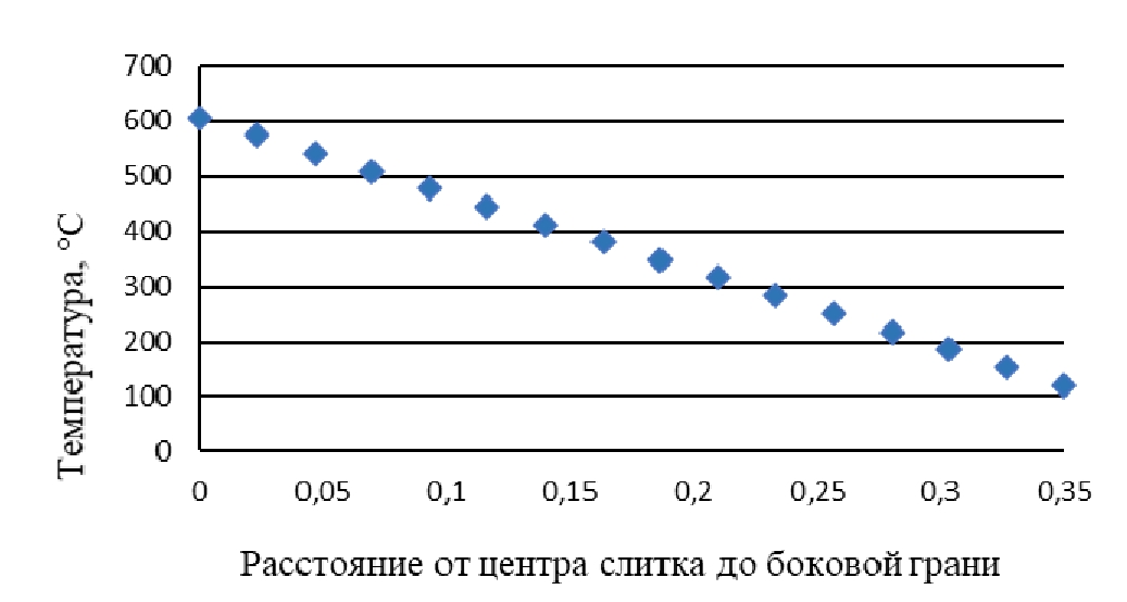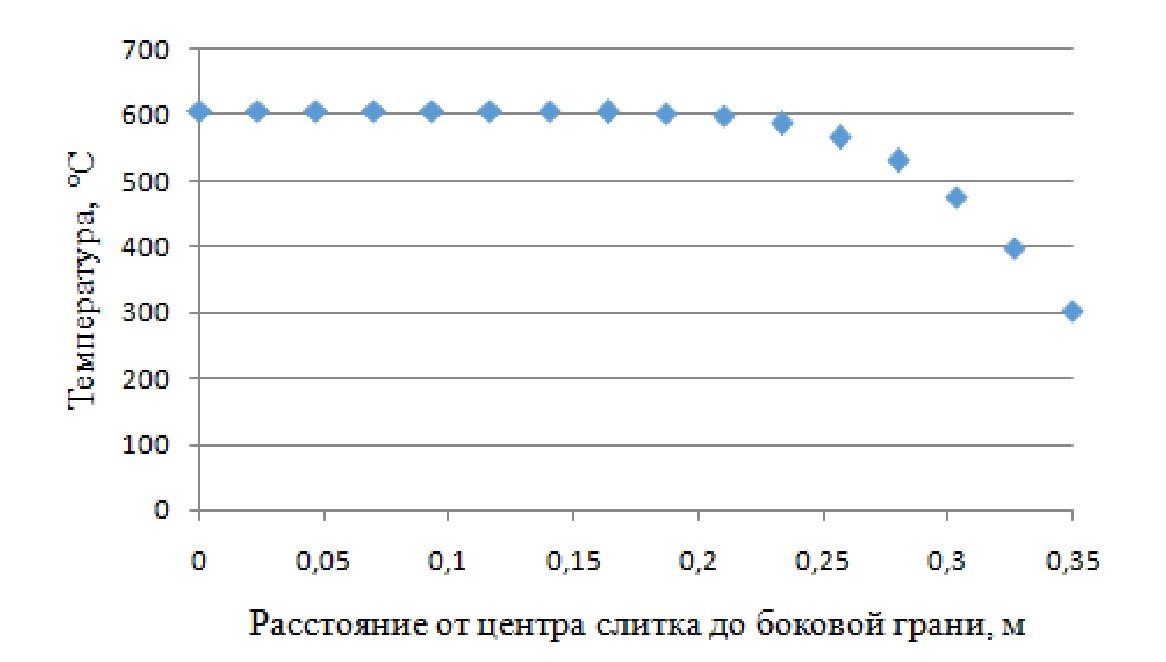 Fig. 5 shows that with the specified casting parameters, the solidus point is located at the moment the ingot leaves the mold (30 seconds after the start of the calculation) under a stream of water at a distance of 10 cm from the ingot surface, i.e. there is 10 cm of solidified metal. 3-5 seconds after the start of the calculation, the solidus point is located at a distance of 4-5 cm from the end of the ingot.