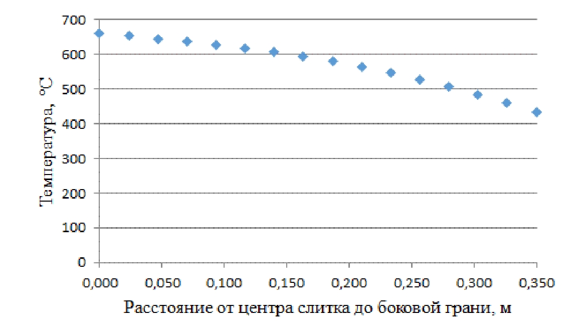 To verify the adequacy of the model, it is necessary to compare it with experimental data. But in the described technological process, it is possible to measure the temperatures of only the metal in the metallotract. All other surfaces of the ingot and tooling are closed or in water. We measured the surfaces of the finished ingot just extracted from the casting machine and performed calculations using ProCAST software [15]. We can talk about the qualitative compliance of the above calculations with possible measurements and calculations in the ProCAST software. For more accurate identification of models in the future, it is necessary to carry out calculations with a change in the height of the ingot, comparing the casting speed and calculation time for the width of the ingot, adjusting the initial