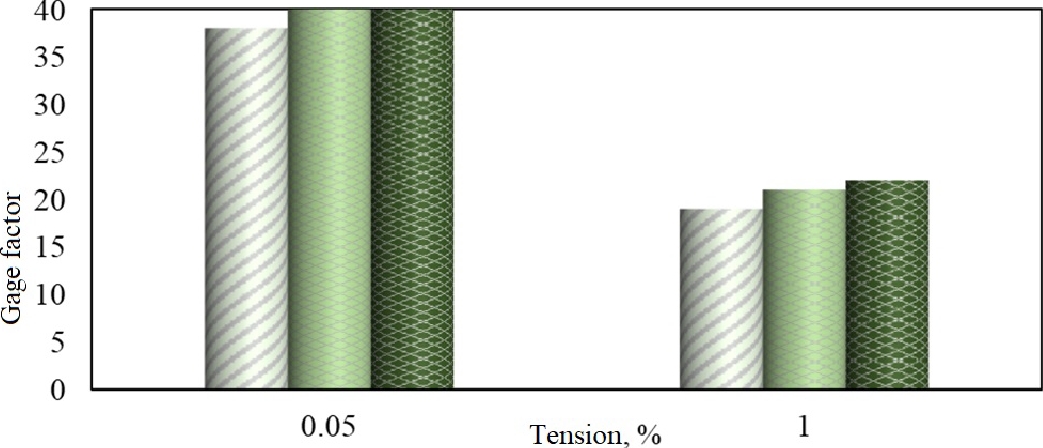 The maximum value of the strain resistance coefficient was observed at the initial stage of the study (0.05 % tension): at 0.1 mm tension at a total length of 200 mm in the samples of the nanocomposite material with hybrid filler SiC 1, 5 and 10 % and is 38, 40 and 40 respectively. The strain resistance coefficient of the nanocomposite material samples with SiC hybrid filler content of 1, 5 and 10 % at maximum tension (1 %) is about 19, 21 and 22 respectively.
