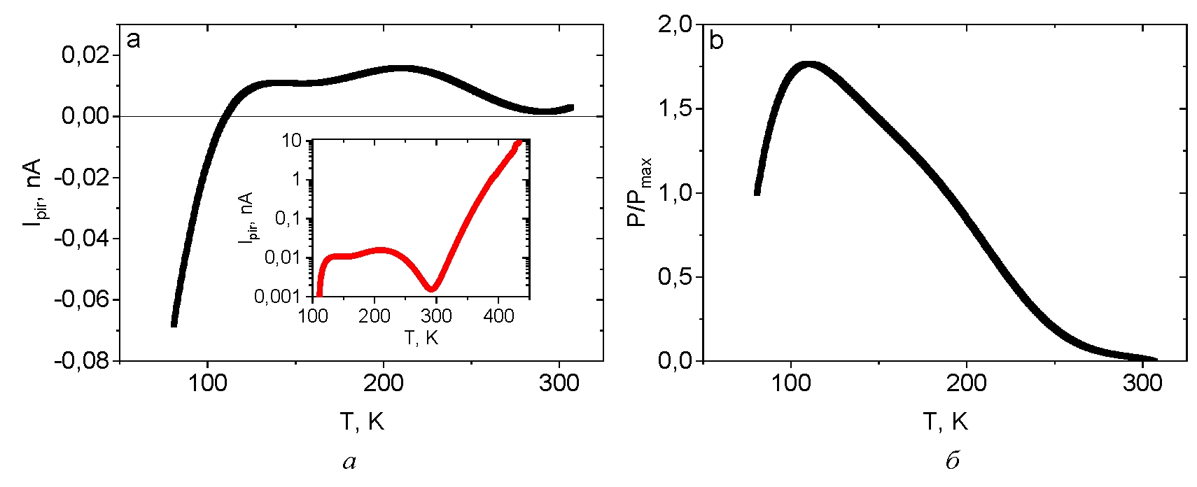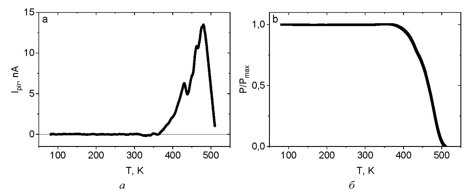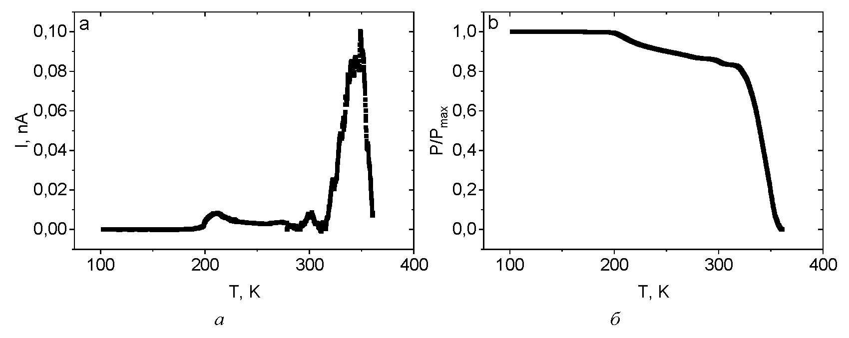 Рис. 2. Температурная зависимость пиротока (a) и относительное изменение поляризации (б) для Tm0,08Mn0,9Se