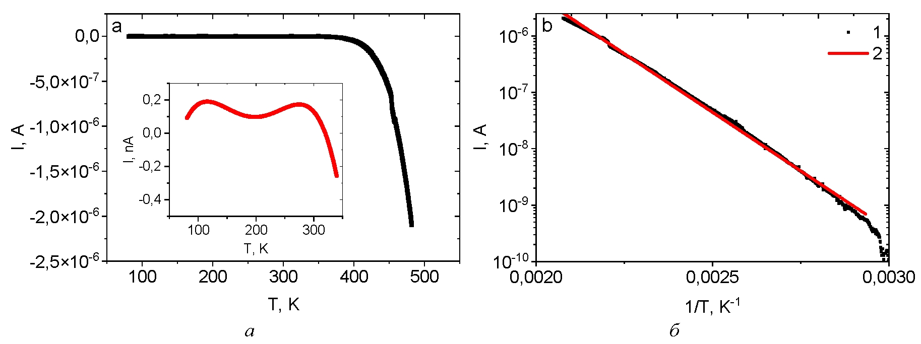 Рис. 3. Температурная зависимость тока (a) и экспоненциальная зависимость тока от обратной температуры (б) для Tm0,2Mn0,8Se. Вставка: Температурная зависимость тока для Tm0,2Mn0,8Se