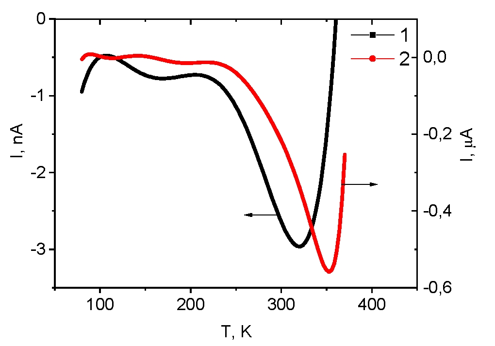 Рассмотрим, как влияет анион халькогена на ток в нулевом поле и чем он вызван. На рис. 4 приведена температурная зависимость тока для твердых растворов TmxMn1–xS с x = 0,05; 0,15 в интервале температур 80–380 К. Максимальное значение тока достигается при температурах 320 К для х = 0,05 и 355 К для х = 0,15. Эти максимумы обусловлены эмиссией электронов с глубоких ловушек, и температуры максимумов термоэмиссионного тока коррелируют с температурами исчезновения ИК поглощения на частоте ω1 = 3116 см–1 [26].