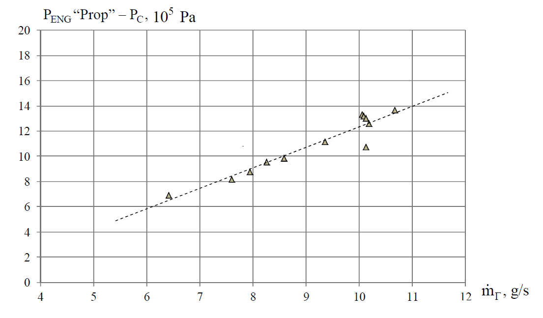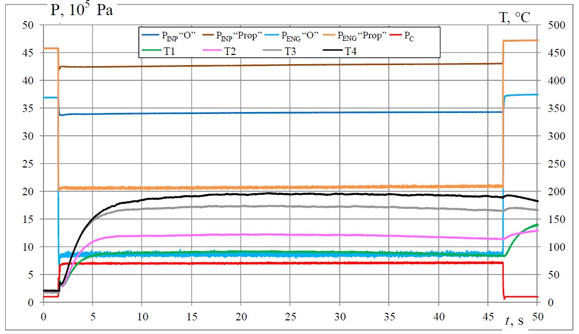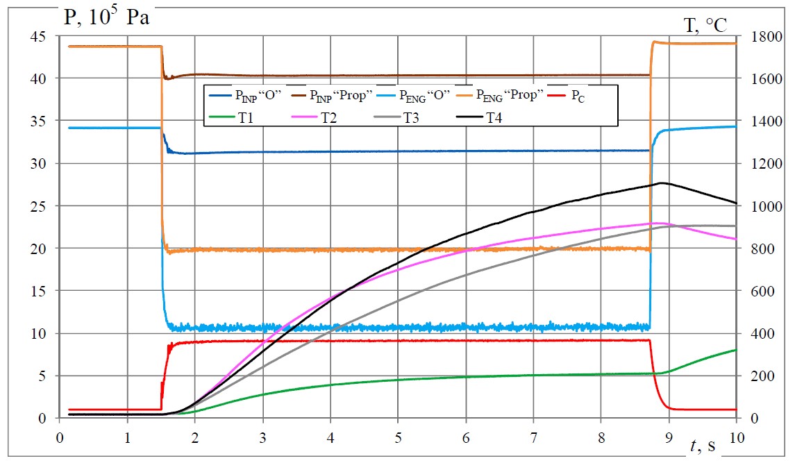During the tests, the recorded data are the values of the pressures of the propellant components in front of the flow-metering nozzles РINP “О” and РINP “Prop”, after the nozzles (that is the pressure at the entrance to the LTRE) РENG “О” and РENG “Г” and in the combustion chamber pC, as well as the temperatures of gaseous oxygen and hydrogen.
