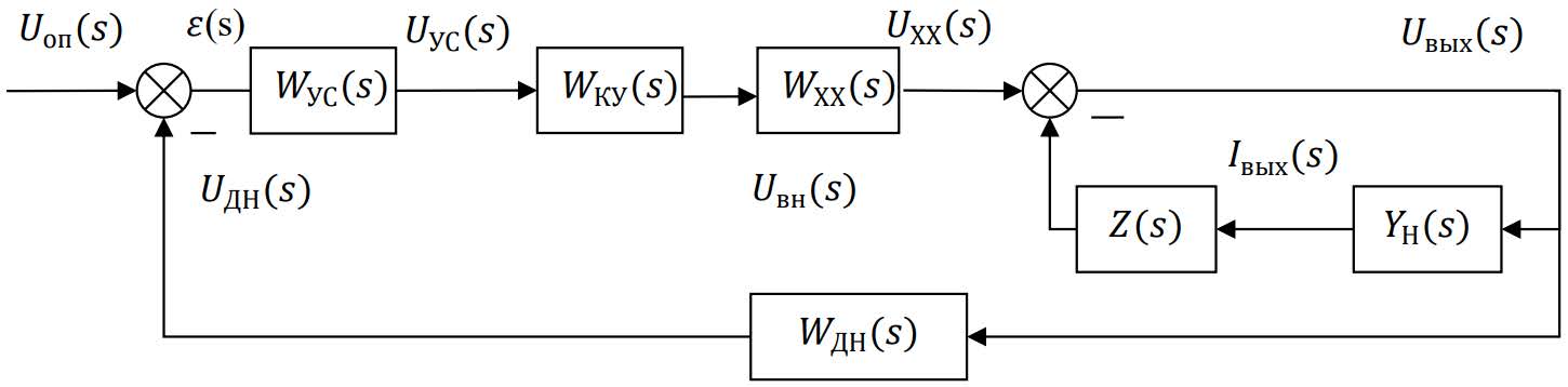 WУС(s) – передаточная функция (ПФ) усилителя-сумматора; WКУ(s) – ПФ корректирующего устройства (КУ), обеспечивающего устойчивость и требуемое качество переходных процессов системы управления ИСЭП; WДН(s) – ПФ цепи обратной связи; WХХ(s) – ПФ УМ в режиме холостого хода; Z(s) – внутренний импеданс УМ; YН(s) – адмитанс нагрузки