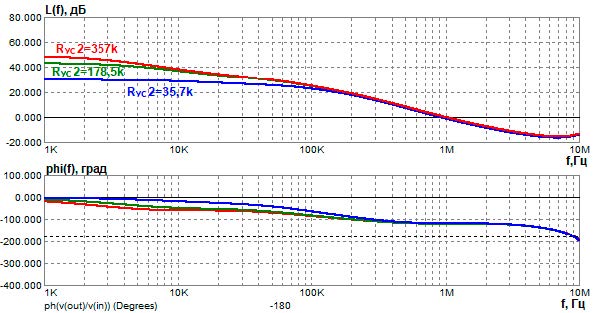 Рис. 9. ЛЧХ скоректированной системы управления модуля ИСЭП при изменении сопротивления RУС2 (способ 2)