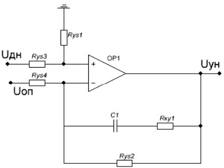 The second method to regulate the IFR of the PSSS [15] also consists in changing the AA transmission gain by means of the RAA2 resistor and changing the FC parameters by means of the RFC1 resistor, but differs in the electrical scheme of connecting the FC and the AA. In this case, the negative feedback in the AA is initiated not from the AA output, but from the output of the FC (Fig. 8), i.e. the FC enters the control loop of the OA, forming a second-type FC. The simulation model of the open loop of the corrected control system of the PSSS module differs from Fig. 2 in that the OA and the FC are replaced by the scheme of the second-type FC (Fig. 8).