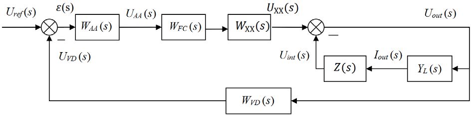 WAA(s) – transfer function (TF) of the adder amplifier (AA); WFC(s) – TF of the feedforward compensator (FC), ensuring stability and the required quality of transient processes of the PSSS control system; WVD (s) – TF of a feedback circuit; WХХ(s) – PF of the PA in idle mode; Z(s) – internal impedance of the PA; YL(s) – load admittance