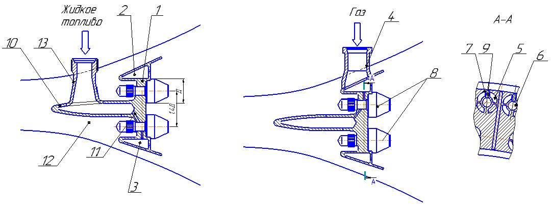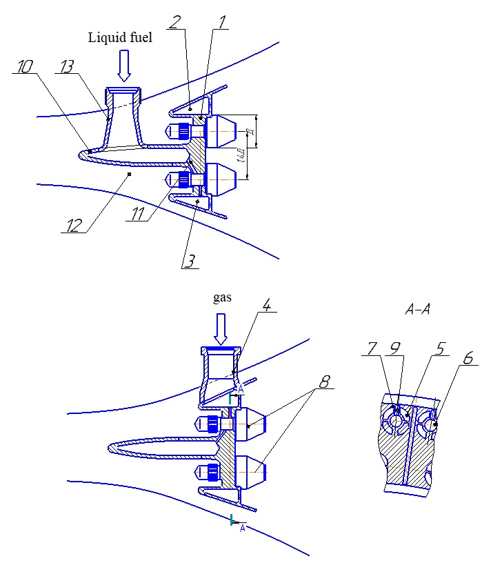 The injectors 8 contain two cavities 14, 15, one of which is connected to the outer 2 and inner 3 fuel collectors filled with gaseous fuel (gas), and the other - with channels for supplying fuel 11 from the hollow annular collector 10 filled with liquid fuel. The injector 8 is equipped with a liquid 16 atomizer and a gaseous 17 atomizer [8].