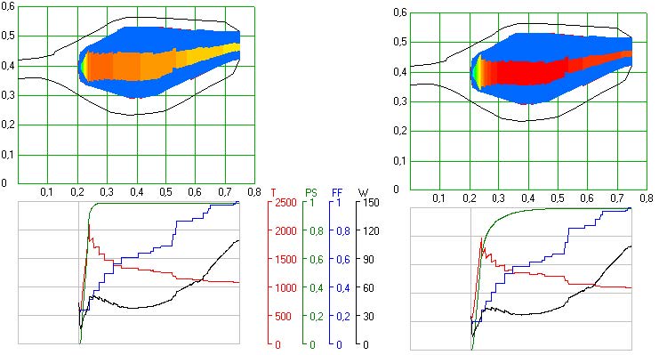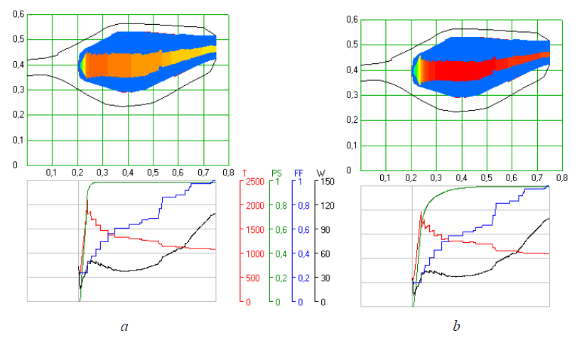 Fig. 6 shows that during combustion of diesel fuel a higher flame temperature is observed in the combustion zone. The efficiency of combustion almost immediately reaches its maximum value. The distribution of velocity along the length of the flame tube is similar, since it is determined by the geometric features of the flame tube [15].