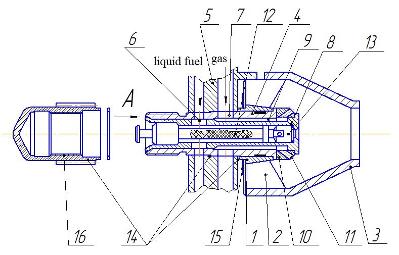To implement dual-fuel combustion at the first stage, a dual-fuel injector (Fig. 1) was developed, which contains a swirler body 1, including a vane swirler 2 and a mixing sleeve 3, as well as a nozzle body 4, which is installed in a gas distribution device 5. The swirler body 1 contains two fuel supply channels: for liquid fuel 6 and gas 7. A gas distribution sleeve 8 is installed in the internal channel of the nozzle body 4, forming a fuel channel 9 between the nozzle body 4, and a sprayer 10 with holes 11 is installed between the nozzle body 4 and the gas distribution sleeve 8. An elongated mesh filter 12 and a centrifugal liquid fuel sprayer 13 are installed in the center of the gas distribution sleeve 8. To ensure tightness, the dual-fuel injector contains sealing rings 14, a splined nut 15, which, using a threaded connection, fixes the body of the injector 4 in the gas distribution device 5, and to ensure a given air flow through the vane swirler 2 has a throttle plate 16 [6].