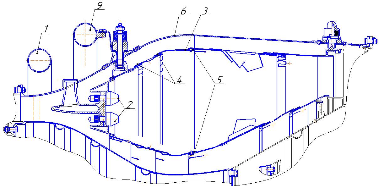The dual-fuel chamber consists (Fig. 3) of a housing 6, a flame tube 3, a liquid manifold 9 and a gas manifold 1 for feeding gas to the injectors 2. The flame tube is annular, consisting of several sections. Between the rings, when connected, spacer plates 5 or corrugated tapes 4 are installed, which serve to create film air cooling. The flame tube is suspended from the front side using clamps 7. Rings 8 are welded to the rear part of the outer and inner casings, with which they rest on the corresponding annular surfaces of the turbine nozzle apparatus [9; 10].