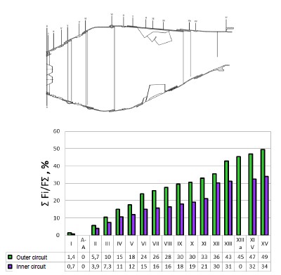 The obtained value of local combustion completeness Δηi characterizes the combustion completeness in relation to the fuel at the entrance to the combustion zone under consideration. Summing up all the combustion completeness values up to the calculated cross-section allows us to obtain the change in the absolute value of combustion completeness along the length of the flame tube ηi: