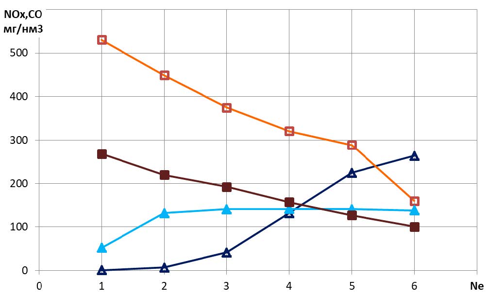 Рис. 7. Сравнительный график эмиссии вредных веществ от режима работы двигателя СО: