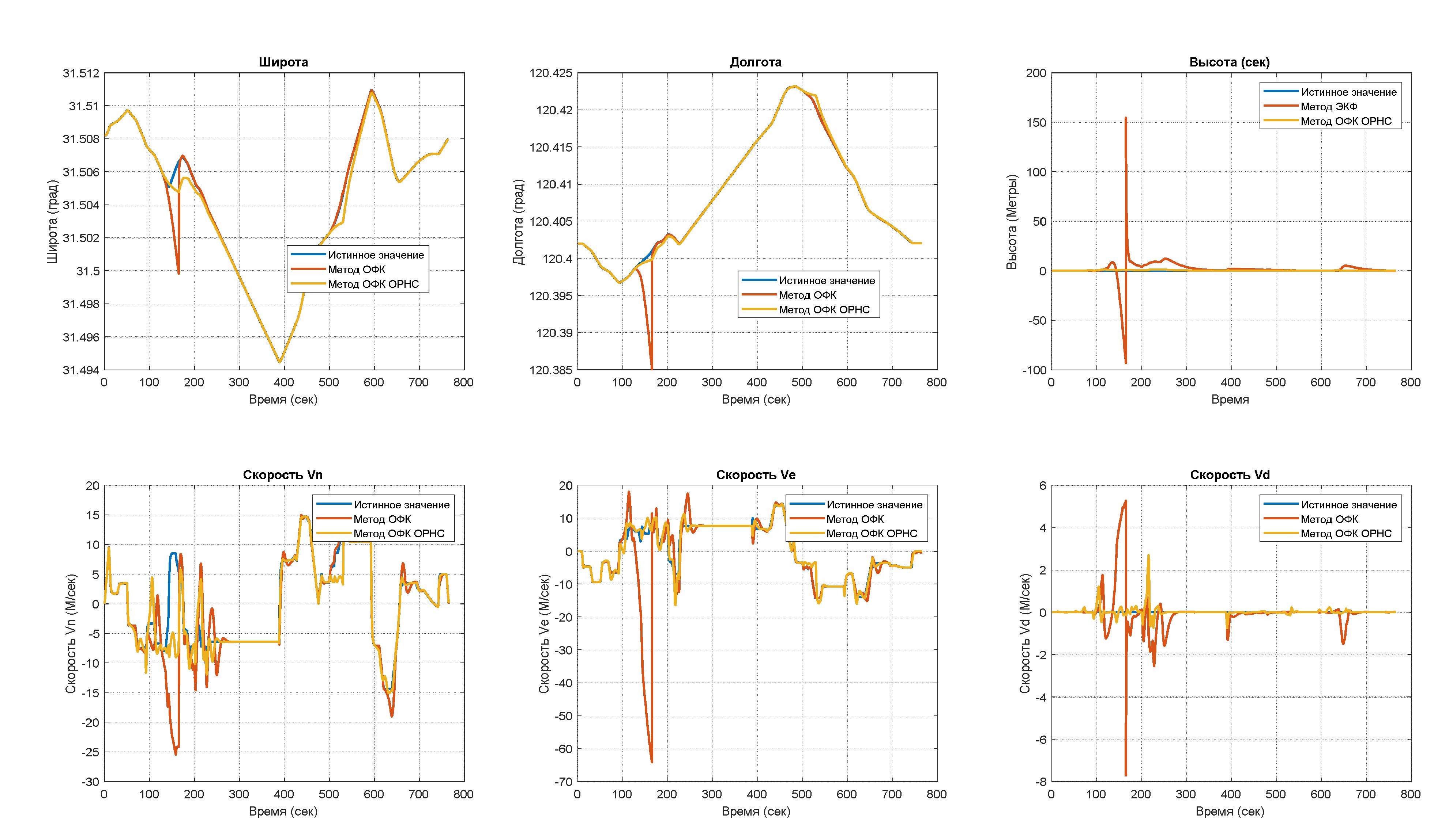 To evaluate and simulate the absence of the GPS signal, two signal interruption periods were created on two different cycles with different durations: the first interruption lasted 40 s, and the second lasted 30 s. This dataset does not contain any altitude variations. The total experiment time is 760 s. The results of the experiment are presented in Fig. 3–6.