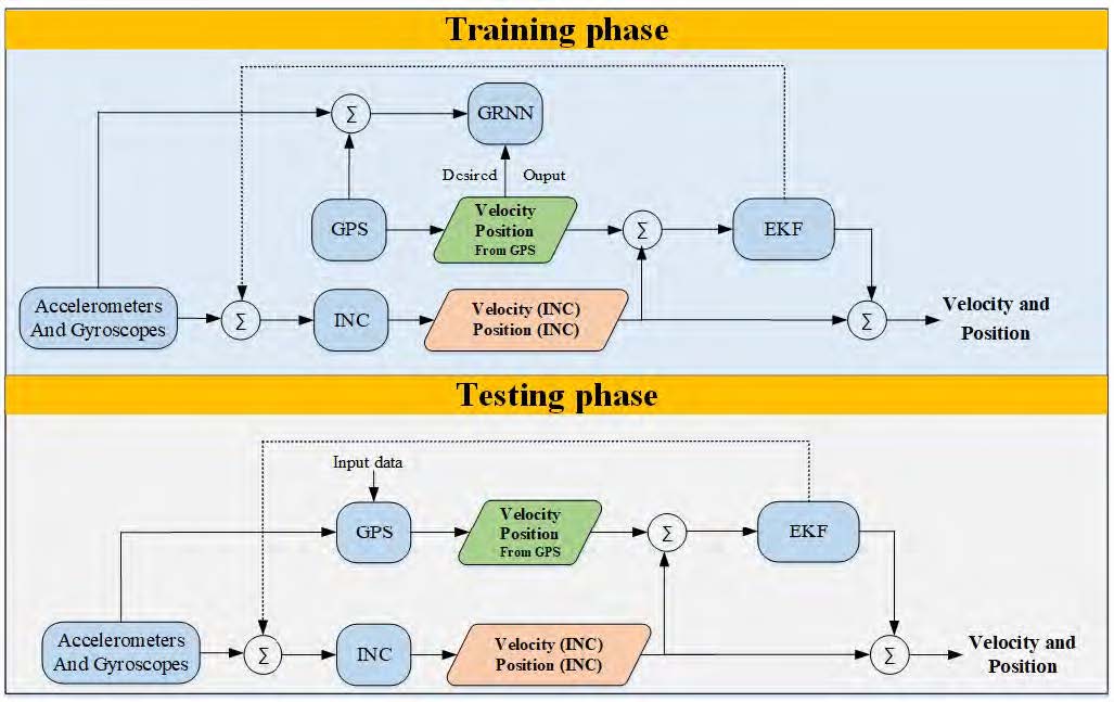 During the training phase, the GRNN uses input data and required output values obtained from available GPS measurements. It results in a trained GRNN model that, in the absence of GPS measurements, is used to estimate the measurements to compensate for the unavailability of GPS.
